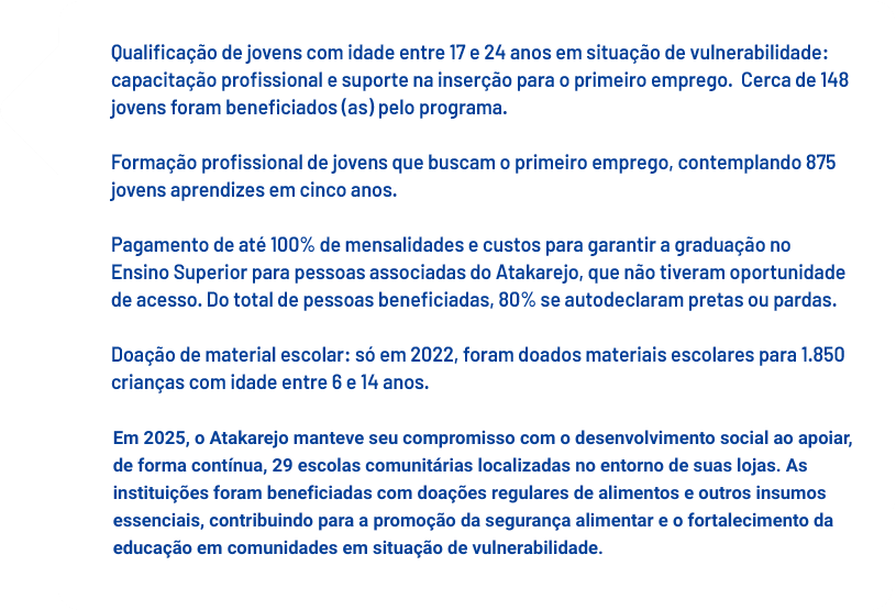 Um programa de responsabilidade social pautado na diversidade e inclusão se faz com ações concretas de intervenção, com impacto transformador na vida das pessoas. Aqui, listamos algumas das ações do Atakarejo: