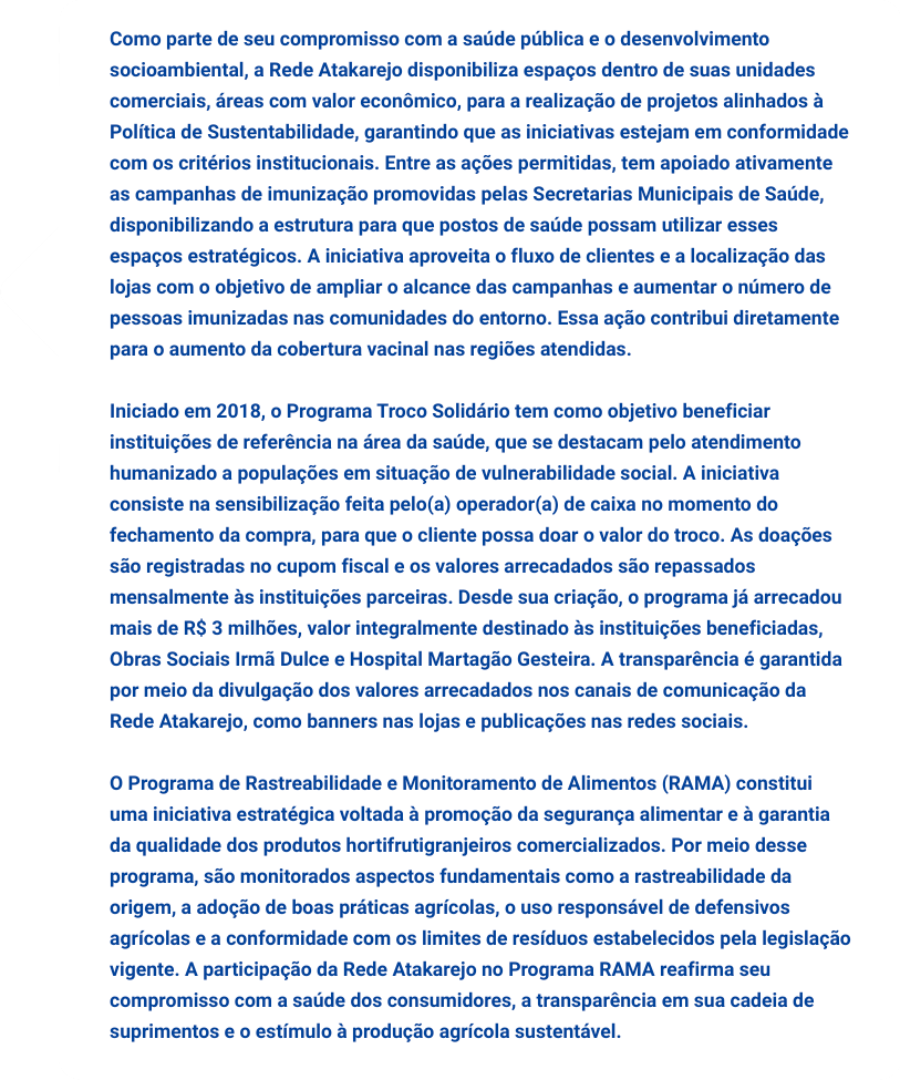 O Atakarejo se compromete a manter e aprofundar o “Programa de Diversidade: Enfrentamento ao Racismo Estrutural”, atuando nos seis pilares iniciais relacionados, conforme a seguir: